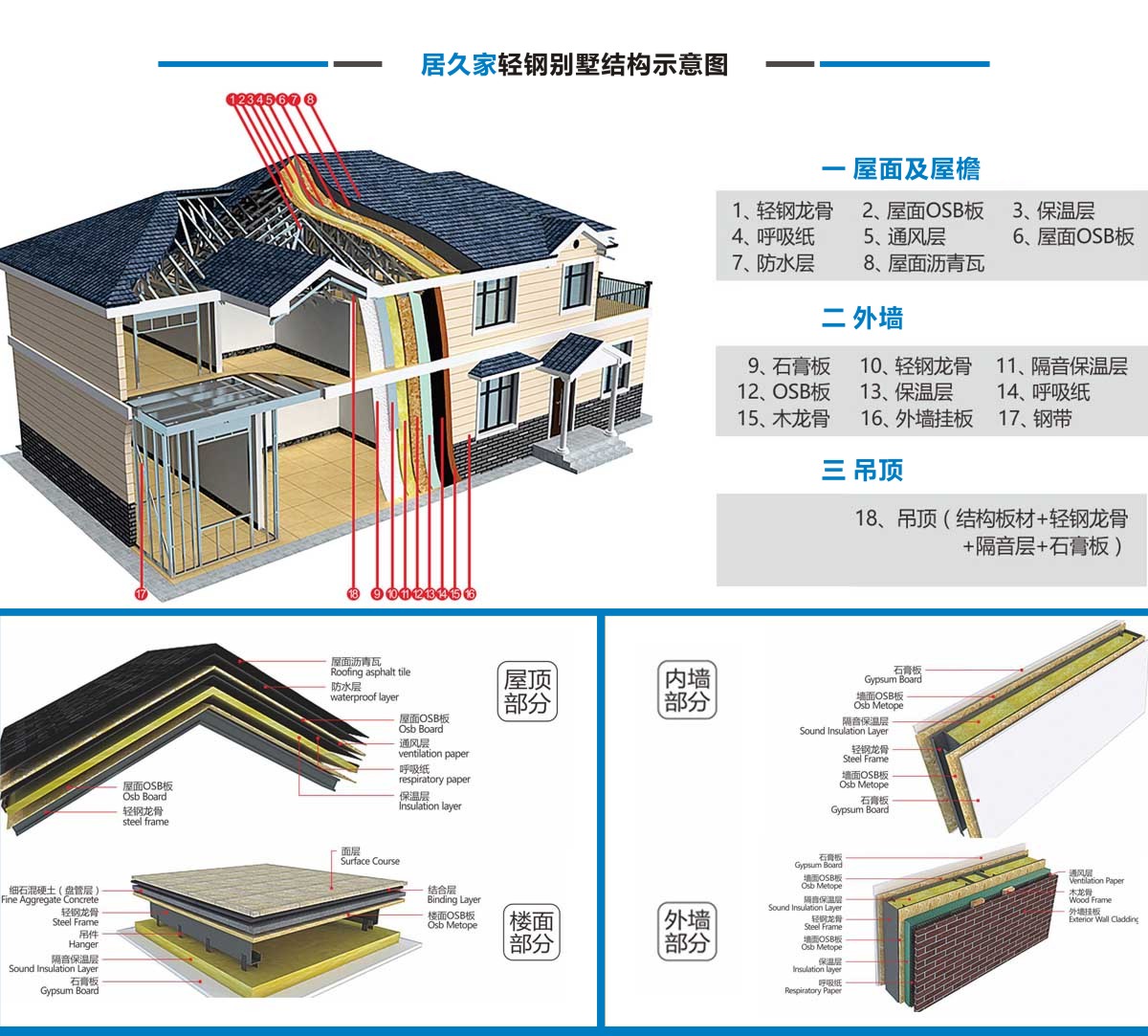 居久家輕鋼別墅隸屬于四川萬建城建筑工程有限公司,集科研、設計、咨詢、加工、生產安裝為一體。一直致力于新型輕鋼結構房屋的研究、開發和應用,倡導房屋建筑的設計和應用在標準化、模塊化、通用化、規?;a的同時,實現人居環境的個性化、人性化、以及健康和舒適。 公司目前引進具有國內先進水平輕鋼結構房屋建筑技術和生產線,標準化、精細化和定制化設計、制造、安裝輕鋼結構房屋。不僅能夠提供風格各異的別墅建筑,同樣能夠提供行業標準的輕鋼樓宇建筑及建筑群。居久家裝配式房屋技術體系是高效節能型綠色建筑體系,各項建筑物理性能卓越,處于業內先進水平,能夠為客戶提供全程模塊化綠色建筑集成解決方案。